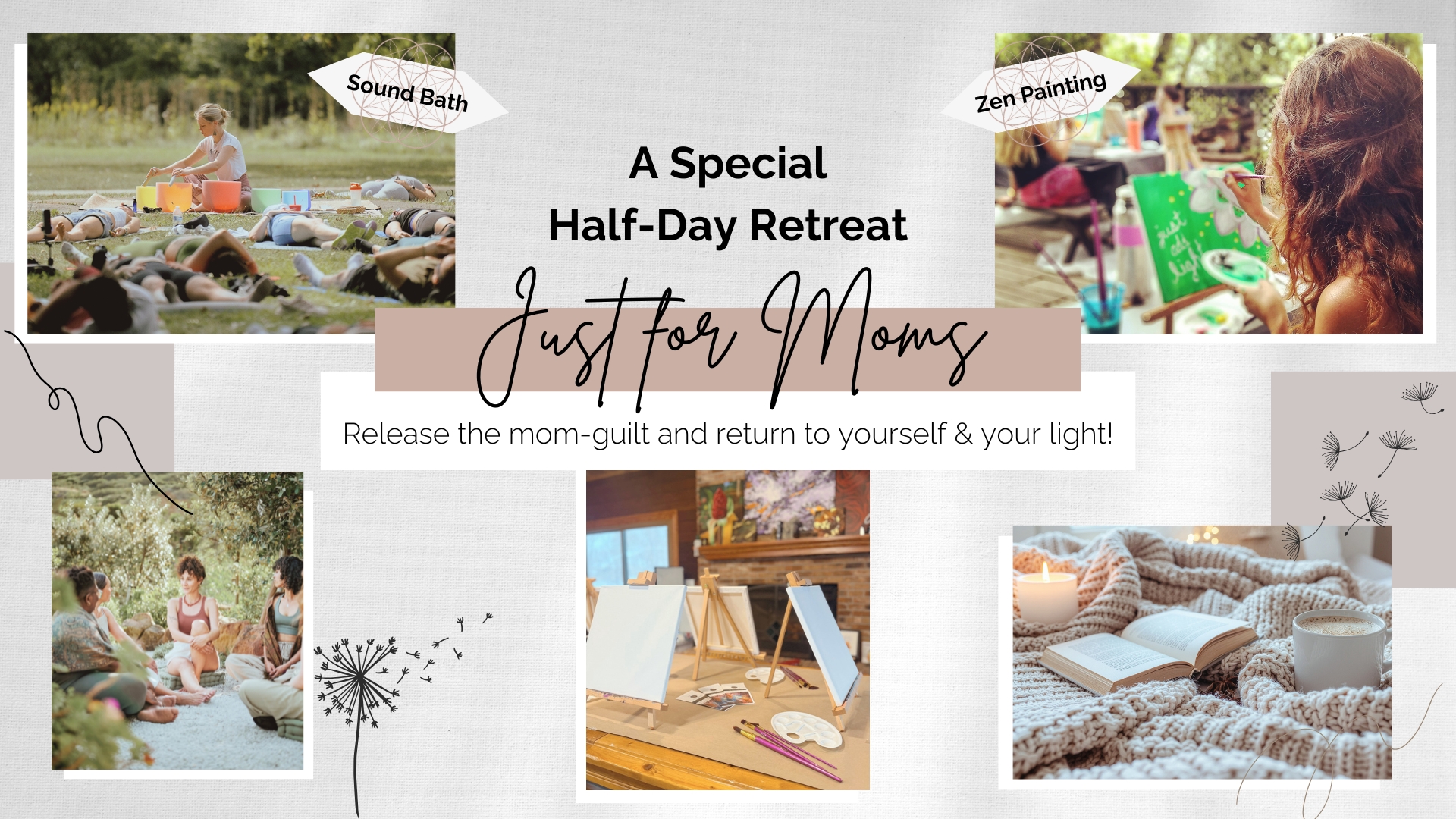 This half-day mini-retreat experience includes a journey inward to release mom-guilt & reconnect with the powerful woman you are - beyond being a mother! Come pamper your inner self! Get bathed in sound healing and then create a personal powerful painting, showcasing your authentic expression.